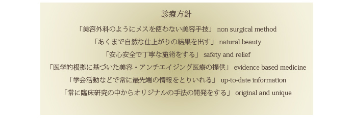 私自身は美容医療に携わった10年以上の経験があり、提供する治療のほとんどを自ら体験 しておりますので、受診された患者様には安心して治療を受けて頂く事ができると思います 。 ![]()